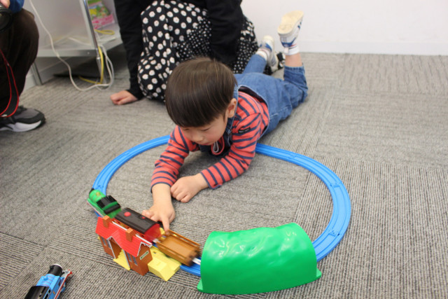 床にレールを並べて、電動で走行させてみます。トンネルをくぐる様子を面白そうに見たり、あらた君自身がレールをまたいでトンネルになってみたり。身体を使ってプラレール遊びを楽しんでいます。