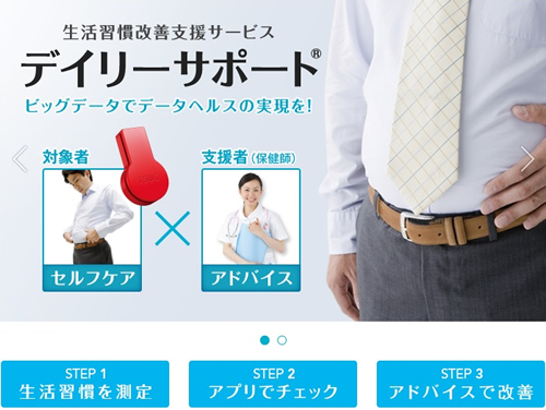 「デイリーサポート」は、ウェアラブルデバイスとスマートフォンを活用して、継続的に生活習慣の改善をサポートするサービスで、日本予防医学協会を通じて、おもに健康経営を目指す企業や健康保険組合への提供を行う。