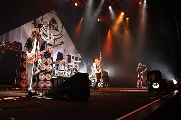 大きなアンプやスピーカーをいくつもステージ上に並べて、さながら要塞といった趣の彼ら。この日は“COMMUNE”と大きくイベント名の入った大きなバックドロップに、各バンドのロゴがライトで映し出されるというオシャレな演出だった。
