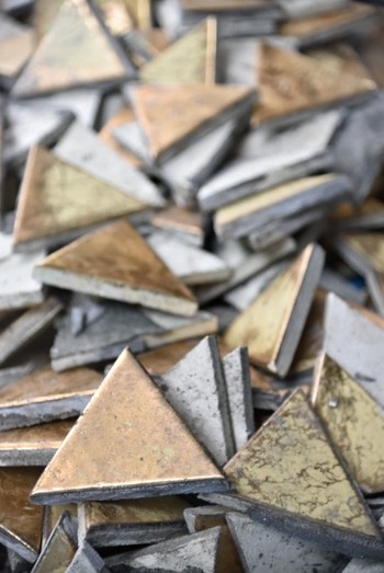 ここに使われている鱗文の金色のタイルは、オブジェとして販売されます。