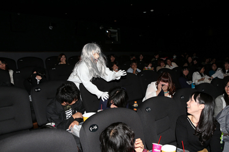 試写会では映画の上映後にスクリーンに時計盤が出現し、針が9時半を指したところで客席におばあちゃんが乱入。観客からは悲鳴があがり、「ばあさんヤバイ!」、「ガチで怖い」という声が聞かれた。その後、おばあちゃんは急に優しくなり、会場の出口で手作り風クッキーをお土産に配布。観客はおばあちゃんと記念撮影をしたり、ハグをはじめるなど、楽しい時間を過ごした。