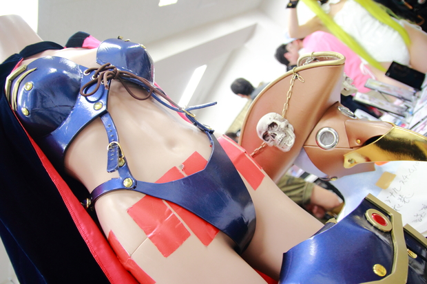 鎧風の衣装とペストマスクが並んでいるのは「ドレス」ブース。「これらを着用して撮影する人もいますね」と語る売り子さん。こんなカッコイイ衣装を着用した女の子がセクシーポーズを決めたら……考えただけで新たなフェチに目覚めそう(笑)。
