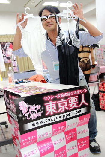 セクシー衣装を両手に持っているのは「東京要人」の加藤さん。コスエクスプレス初出展にもかかわらず、セクシー衣装がかなり売れて大満足の様子。