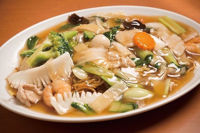 焦げ目をつけて焼いた麺とオイスターソースベースのとろみがかかったあんかけやきそば。
