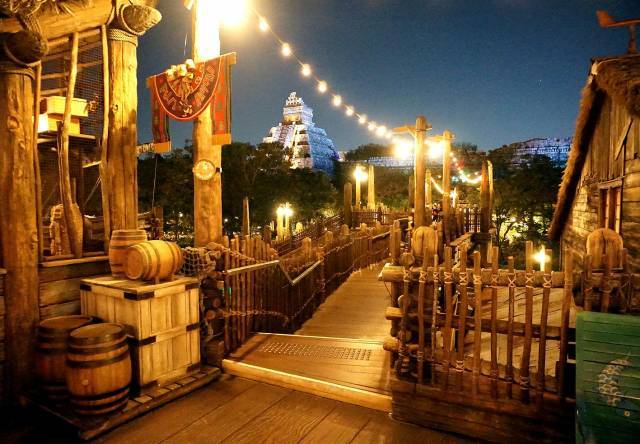 この橋から眺める「インディ・ジョーンズ・アドベンチャー:クリスタルスカルの魔宮」の神殿の姿は、ちょっと怪しい雰囲気ですが、冒険心もくすぐられる気がしませんか?