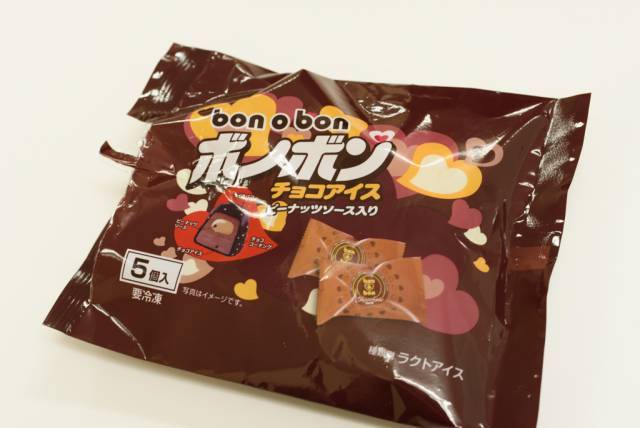 「コラボが得意なセリア・ロイル。このアイスは、うまい棒でおなじみのヤオキンとのコラボアイスです。ボノボンチョコというお菓子のアイス版になります。製造は粒タイプが得意なスカイフーズです。チョココーティングの粒タイプアイスはいろいろありますが、ライスパフが入っているのは新鮮ですね。中はピーナツソースが入っていて濃厚。個装されているので、みんなで食べやすいと思います。見た目よりもしっかりした味がして、おいしいですよ」