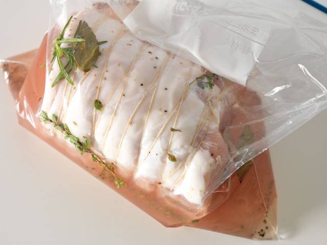 3. 密閉袋に1と2を入れて空気を抜き、最低5~6時間、できれば12時間程度冷蔵庫で漬け込む。