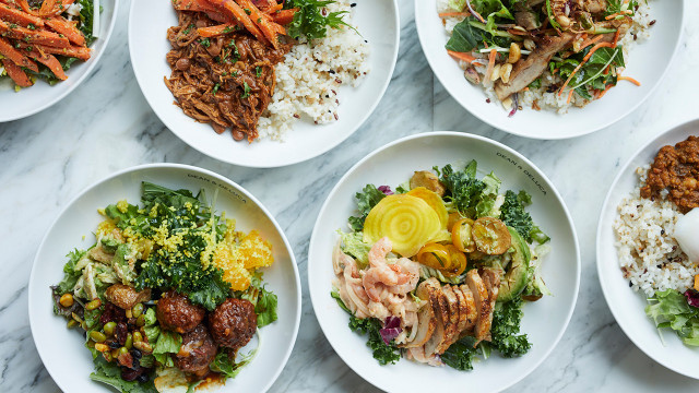 カフェの人気メニュー「デリボウル」は、彩り豊かな野菜中心のデリと温かいミートボールやチキンなどの主菜をバランスよくひとつのボウルに盛り付け。