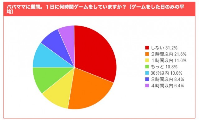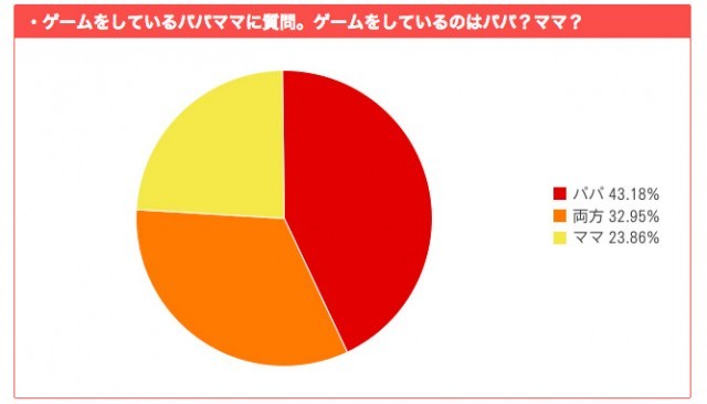 パパとママ、どちらがゲームをしているかの質問には、パパが43.2%、ママが23.9%。両方と答えたのが33%。最近はゲームをする女性が増えてきたとの調査報告もあるが、まだ男性優位は変わらないようだ。
