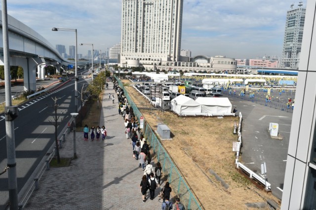 ミニオンズランフェスの会場まで、ゆりかもめ「東京テレポート駅」か「船の科学館駅」から歩いてくる人が多く、受付までの行列も凄いことになってる……。