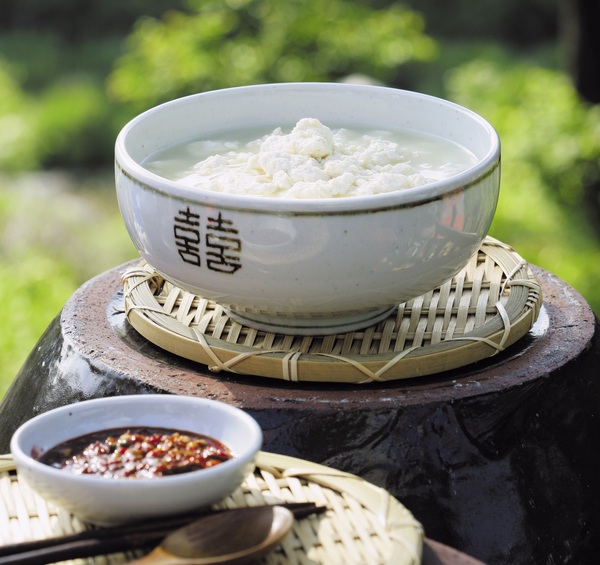 江陵の純豆腐は、東海岸の海の海水をにがり代わりに使って固めたもので、ふわふわと温かく、柔らかくて香ばしいのが特徴。大豆の味がしっかりと感じられる昔ながらのおぼろ豆腐が味わえます。お店によって異なる薬味の入った醤油ベースのタレをかけていただきます。