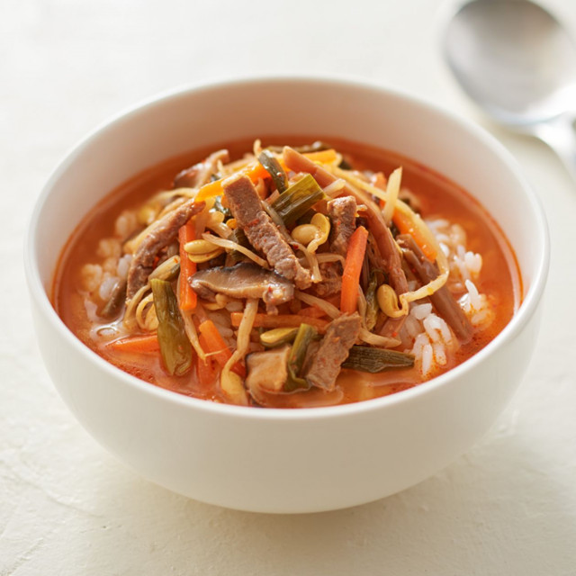 煮出した牛骨のコクと唐辛子やコチュジャンの風味を生かした辛味と旨みのスープ。具材は、牛肉、ぜんまい、豆もやしなど。