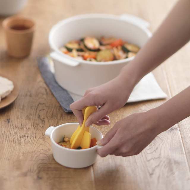 分解して2つに分けて使うと、フォークとナイフのように食材をおさえながら野菜を一口大に切ったり、肉や魚をほぐすことができます。