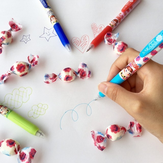 「サラサクリップ」は、ジェルインクの特性を活かした鮮やかな発色と、さらさらした書き味が特徴のボールペン。今回発売される「サラサクリップ×不二家」は、ボディとインクに不二家の人気商品「ミルキー」「カントリーマアム」のほか、飲料「レモンスカッシュ」などをイメージした香りが付与されているとのこと。