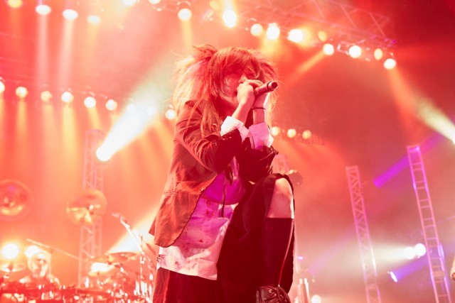 物悲しいサウンドとともに、幕に浮かび上がるシルエットが3つ。そして眩しいほどめまぐるしく点滅するライト。そのまま楽器隊が感情たたきつけるようなサウンドをZeppのフロアに響かせる。この日のために誂えたであろう黒と赤のコントラストが凛々しい要塞のようなドラムセットのSORA(Dr)、くるくると跳ねるように回るMiyako、飄々と凶悪な低音を鳴らすSaZ(B)。