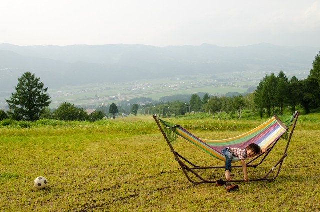 最高の眺め! 広い芝生にハンモックでのんびり
