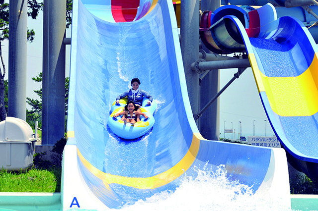 海を眺めながら全長140mのコースを猛スピードで駆け抜けるドキドキのウォータースライダー。