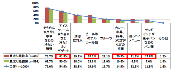 また、「そうめんや冷やし中華などの冷たい麺類」や「アイスクリームやかき氷など冷たく甘いデザート」をはじめ、丼類やパン類など、糖質の多いメニュー中心の食生活も、夏太りの要因になるといいます。