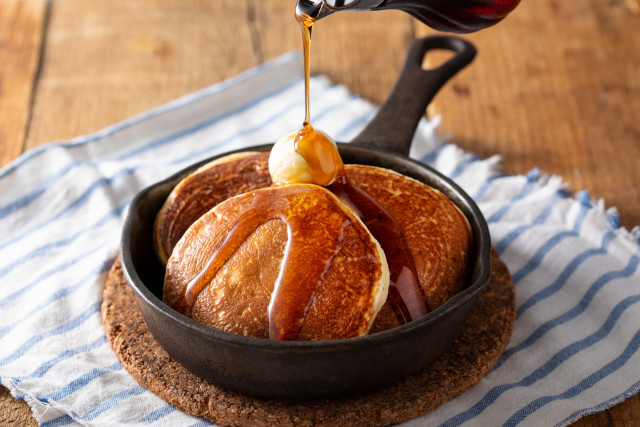 「釜焼きフレンチパンケーキ」は、一度焼いたパンケーキを生クリームアパレイユにつけ込んでから、オーブンで焼きあげ、メープルシロップとバターがとろける“濃厚な一皿”となっています。