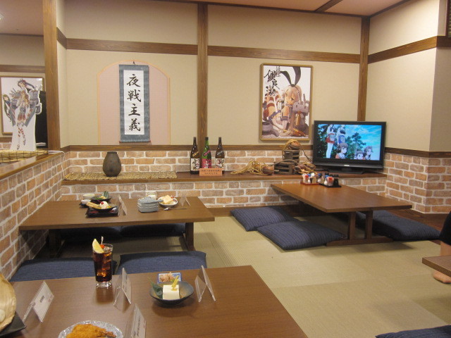 中では笑顔の伊良湖の衣装に身を包んだお姉さんたちがお出迎え。テーブル席と座敷席とがあり、壁に貼られたメニューの札、提督にとって馴染み深い「掛け軸」も趣があります。