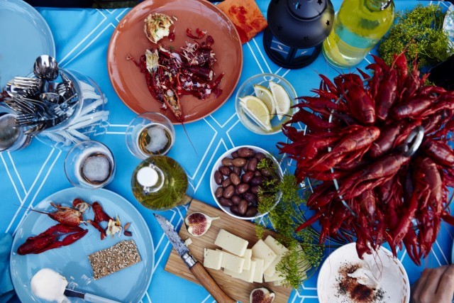 屋外にセットしたテーブルに真っ赤に茹であがったザリガニやパン、チーズ、エビ、さまざまな種類のパイを並べ、友人や家族と一緒にテーブルを囲みます。
