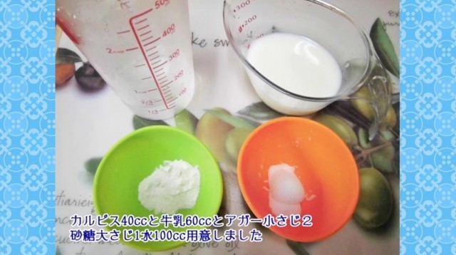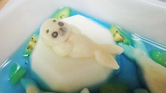 カルピス40cc、牛乳60cc、アガー小さじ2、砂糖大さじ1、水100ccを使って作る特製カルピスゼリーの上に乗ったゴマちゃんの姿は、まるで流氷の上でお昼寝タイムを楽しんでいるかのよう。可愛らしくて食べるのがもったいないですね。