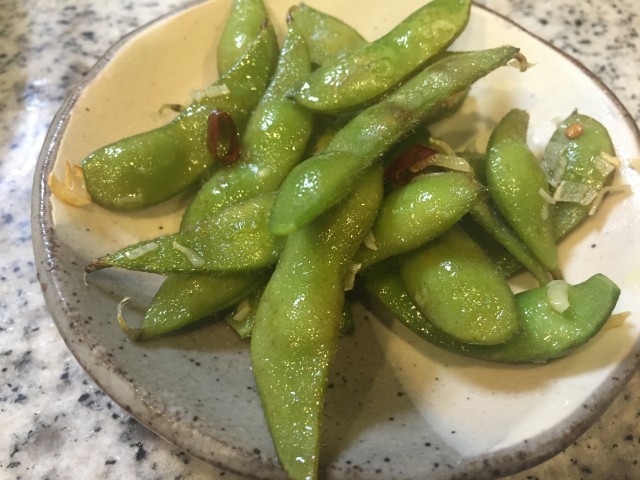 みじん切りにしたにんにくと、輪切りの赤唐辛子をオリーブオイルで、弱火で熱し、香りがしたら、さや付きの枝豆を入れ、和える。好みでこしょうをかけ出来上がり。