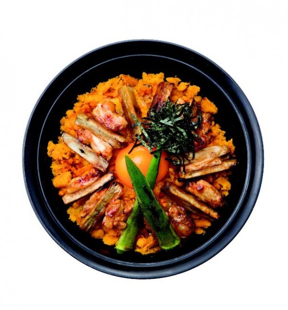 炭火で丁寧に焼いた香ばしいかぼちゃをまぶしたごはんの上に、比内地鶏、ごぼう、オクラ、卵黄が盛られ、味でも見た目でも秋が楽しめる。