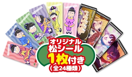 ベビースターラーメンのパッケージには「おそ松さん」6つ子たちのオリジナル描き下ろしイラストが使われ、全3種類が展開。パッケージ裏面には、オリジナル松シール(全24種類)が1枚付属します。
