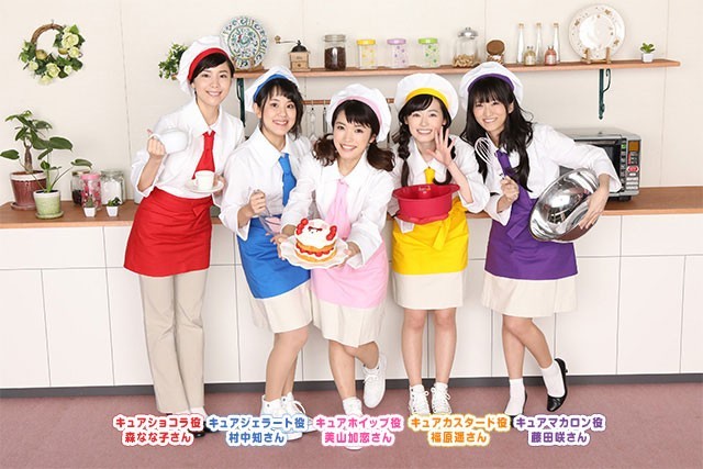 新プリキュア声優陣は、宇佐美いちか/キュアホイップ役を演じる美山加恋、有栖川ひまり/キュアカスタード役を演じる福原遥、立神あおい/キュアジェラート役を演じる村中知、琴爪ゆかり/キュアマカロン役を演じる藤田咲、剣城あきら/キュアショコラ役を演じる森なな子の5人。