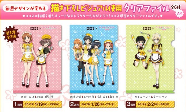 デザインは1週目に「西住みほ&秋山優花里」、2週目に「武部沙織&五十鈴華&冷泉麻子&角谷杏」、3週目に「カチューシャ&ダージリン」が用意されており、すべてココスの制服を着た描き下ろしイラストが使用されています。第2弾でも3種類のデザインを予定しています。