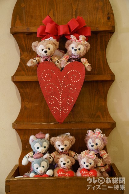 「アーント・ペグズ・ビレッジストア」の正面の扉をくぐると、ハートの中でダッフィー、シェリーメイ、ジェラトーニがお出迎えです。