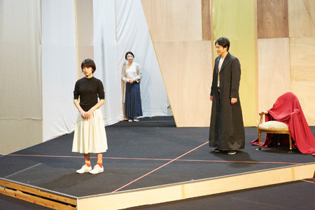設えられていたのは、緩やかな傾斜と、さらに前面には段差のある張り出し舞台。奥には帆のような白幕が垂れ、若干傾いている太い柱が危うさを匂わせている。一幕一場から始まる立ち稽古を前に、平が膨大な量の台詞を身にしみ込ませるべく、懸命に言葉を繰り出していた。一方、大竹は乳母エノーヌ役のキムラ緑子と楽しそうに言葉を交わし、穏やかに開始を待っている様子。栗山が腕組みをして舞台をみつめる中、演出助手の合図で稽古がスタートした。半島の町を想起させる波音とともに、イッポリット、そして彼の養育係であるテラメーヌ(谷田歩)が登場。行方不明の父テゼを探しに国を出ようとしているイッポリットは、胸に秘めたアリシーへの恋心をテラメーヌに言い当てられて苦悩する。