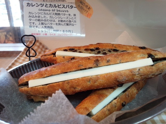 “カレンツとカルピスバター”195円。カレンツがこれでもかとぎっしり生地に練り込まれていて、それだけでも美味しいのに、カルピス発酵バターとの相性がとてもいいんです! バターの厚みも気になりません。これまた買います!!