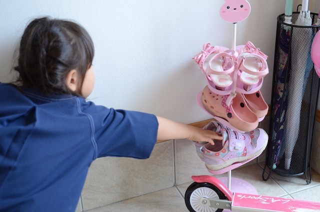 普段履いている靴をそこに並べておいたところ、勝手にお片付け(本人曰く、「プリンセスになるために飾っているの」)するようになりました。子どもの靴が散らばっているご家庭には効果のあるアイテムです。