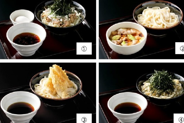 うどんは、冷たいつけ汁のうどんを3種類、温かいつけ汁のうどんを1種類(麺は共通)の提供。卓上には天かす、ラー油、白ゴマ、七味、一味、ゆず胡椒、すりおろし生姜などの薬味が用意されています。