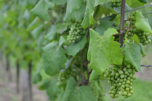 建物に向かって左の階段脇では、白ワインにするリースリング・リオンという品種と、赤ワインにするマスカット・ベリーAという品種が栽培されています。