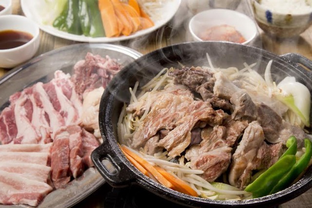 ラムバラ肉、ラム肩肉、豚ホルモン、イベリコ豚肩ロース、豚バラ肉、野菜の盛合わせ(もやし、にんじん、ピーマン、玉ねぎ)、キムチ、オリジナルBBQソース2種、店内ビュッフェ料理食べ放題
