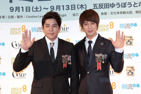 韓国出身の人気グループ・超新星のソンモとSUPER JUNIORのカンインが28日、都内で行われた『ミュージカル 宮』の記者会見に登壇した。