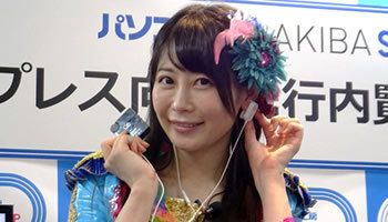 展示商品の骨伝導CLIP型イヤホンを試す「仮面女子」リーダーの桜のどかさん