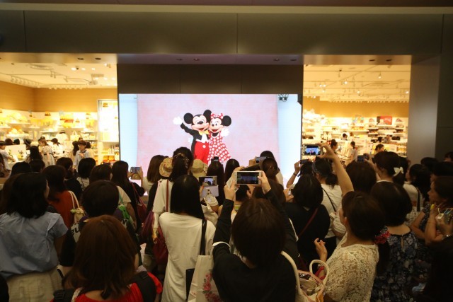 巨大スクリーンにミッキー・ミニーが登場! お店に入る前から楽しい!