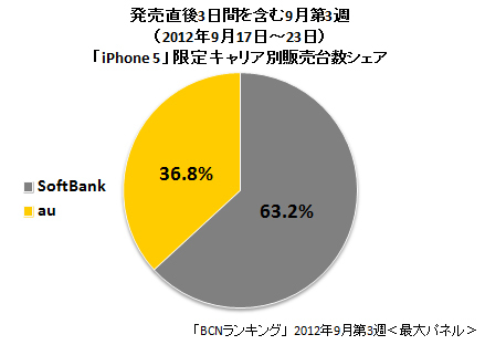 「BCNランキング」によると、「iPhone 5」発売日の9月21日を含む9月第3週(2012年9月17~23日)の携帯電話全体の機種別販売台数1位は、ソフトバンクモバイルの「iPhone 5」の64GBモデルだった。1位から5位までを「iPhone 5」が独占し、7位にはauの「iPhone 5」の16GBモデル、8位にはソフトバンクモバイルの「iPhone 4S」の16GBモデルが入った。