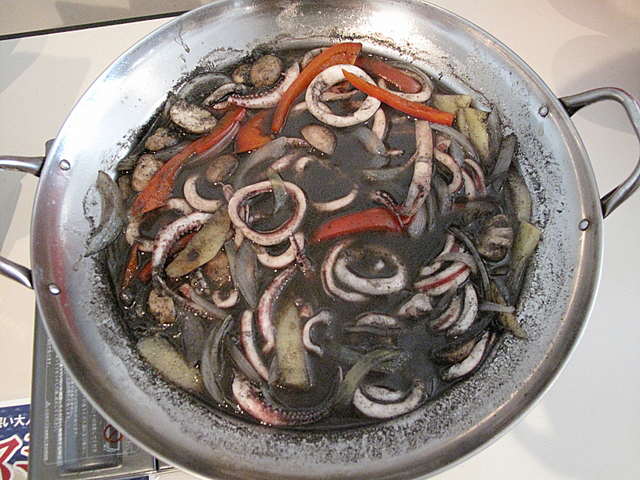 ラストは『地中海風 イカスミ鍋』。具材は、いか、玉ねぎ、パプリカ、エリンギなど、それより真っ黒なビジュアルがインパクトありすぎです。いろんな味の予想が渦巻く中ひと口……おお、すごいスパイシー! ガーリックやアンチョビがベースのスープは、イカスミ独特のコクは残しつつ、黒胡椒がよく効いていて見た目よりさっぱり。これはビールでもワインでもクイクイ進んじゃいそうです。シメにパスタを加えればイカスミパスタが食べられます!