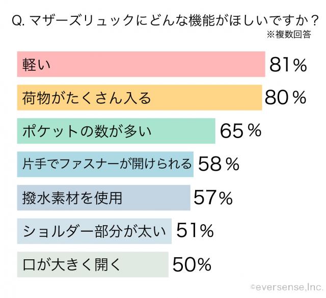 続いて「マザーズリュックにどんな機能がほしいですか?」という質問については、リュック自体が「軽い」ことや「荷物がたくさん入る」という機能は、多くのママが重視したポイントでした。