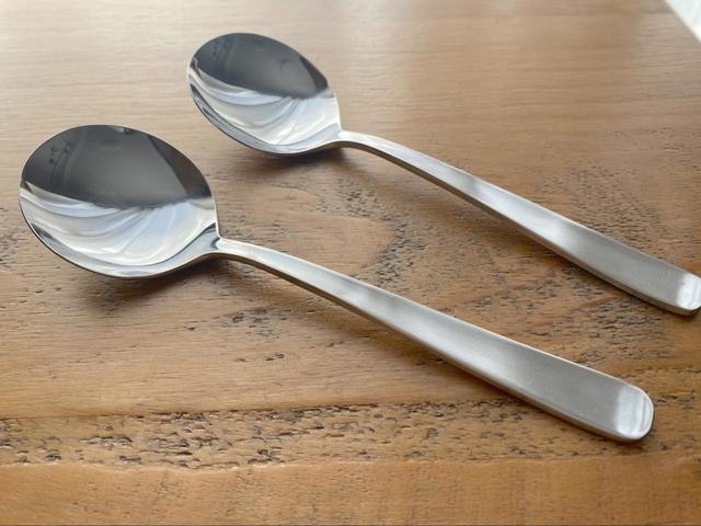 スープスプーンと並べて比べてみると、柄の長さや角度に大きな違いは見られませんでした。