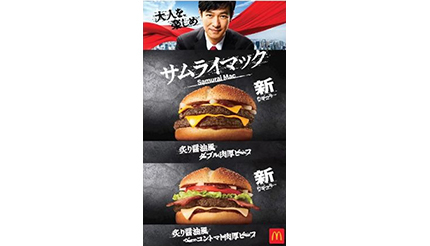 日本マクドナルドは、新レギュラーバーガーとして「サムライマック」と銘打った「炙り醤油風 ダブル肉厚ビーフ」と「炙り醬油風 ベーコントマト肉厚ビーフ」の販売を、全国のマクドナルド店舗で4月7日に開始する。また、同日より「コーク 辛口ジンジャー」「コーク 辛口ジンジャーフロート」の販売を、期間限定で行う。