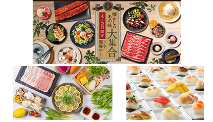 ワンカルビでは、にんにくと唐辛子をたっぷりと使用した特製スパイスが食欲をそそる2000年メニューの「初代ワンカルビ」、コリコリとした食感の上ミノをさっぱりおろしポン酢、お好みでピリリとしたもみじおろしで食べる15年メニューの「炙り上カルビ おろしポン酢」など。きんのぶたでは、13年メニューの「ごまとピーナッツの香りを効かせた本格ごま坦々だし」などが復活している。 寿司 ニラックスが運営する「グランブッフェ」「フェスタガーデン」などのブッフェレストランでは、20店舗で「寿司50品」が堪能できる「別売り」を開始した。「スタンダードコース」「スペシャルコース」がコース内に含まれており、「ライトコース」がコース料金に439円をプラスすれば利用できる。