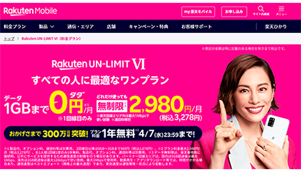 4月7日に終了する楽天モバイル「Rakuten UN-LIMIT VI」の1年無料キャンペーン