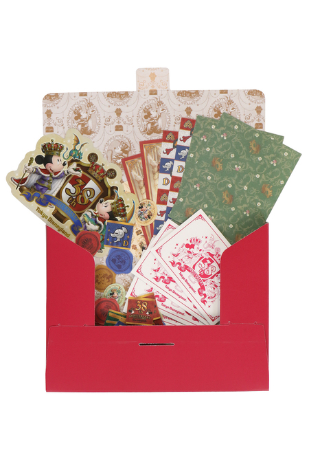 ステーショナリーセットは、便せん8枚(4柄×2枚)、封筒4枚、ステッカー1枚、シール36枚(9柄×4枚)で、それをひとつにまとめる赤いケースに入っています。