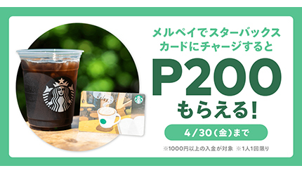 メルカリアプリ内から簡単に利用できるスマートフォン決済サービス「メルペイ」は、「スターバックス カードチャージでP200還元キャンペーン」を4月30日23時59分まで実施している。
